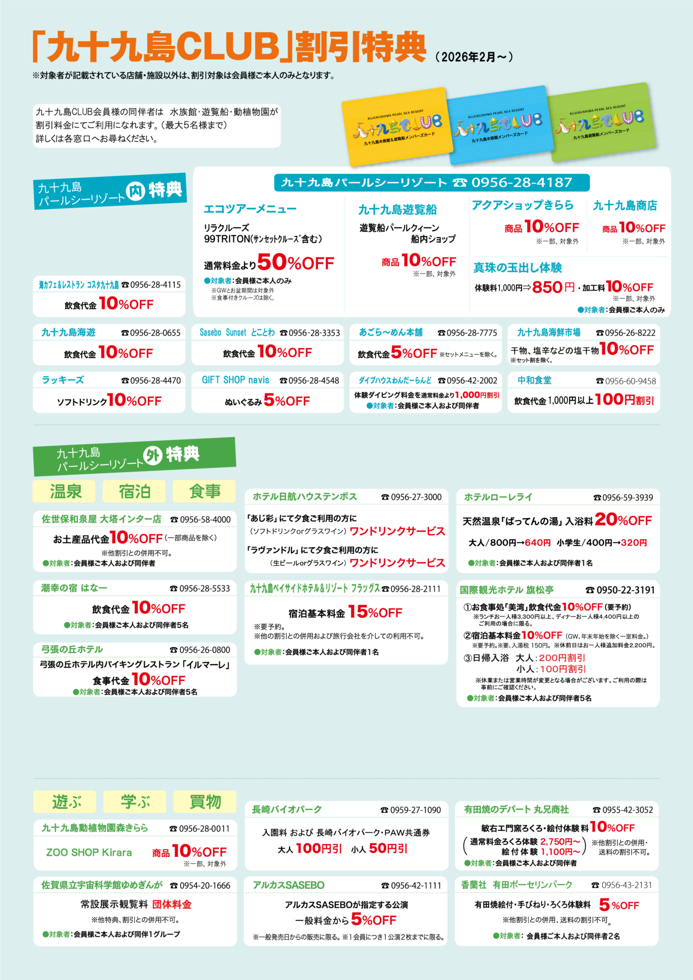 People come with Kujukushima Club members,special rates are available for aquarium, cruising, zoo and botanical garden.(Max. of 5 people)For details, please consult each ticket corner.
